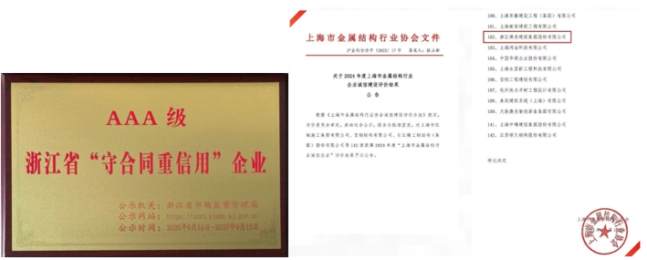 凭借在企业经营中的一贯诚信守约的卓越品质,集团公司近日接连荣获“浙江省‘AAA级’守合同重信用企业”、“上海市金属结构行业诚信企业”两项荣誉。这双荣誉不仅是对集团公司经营规范、履约守信的高度认可,更是集团深耕高质量发展、筑牢信用基石的生动见证,为集团“十四五”圆满收官添上浓墨重彩的一笔,也为“十五五”规划开局注入强劲动力。